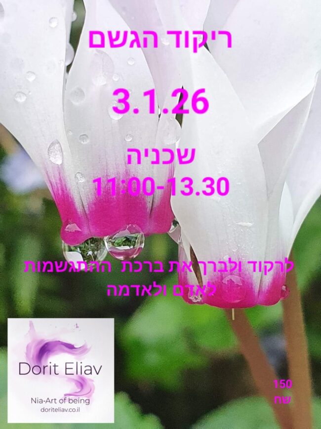 מי לא שמחה עם קולות טיפטוף הגשם? עם הרוחות שמביאות את העננים. המטאורולוגיה מספרת לנו שבלי הרוחות שמביאות את העננים אין גשם –  והמטארולוגיה של האדם, גם היא מספרת שמאחורי כל התגשמות יש את רוח האדם, והמחשבה החופשית והיצירתית. נפגש למצוא את היצירתיות שבתנועה, את המזג האישי בתוך הריקוד .והלוואי ונביא על עצמנו עוד גשמיי ברכה והתגשמות מיטיבה . נפגש במועדון שכניה הנהדר, ב 3.1.26 שעה 11.00-13.30 מוזמנות להביא כיבוד קל לשיתוף ואחווה . .